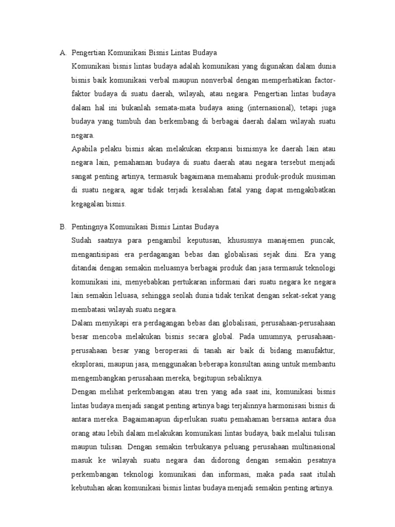 Komunikasi bisnis lintas budaya yang berhasil melahirkan manfaat dalam mengembangkan usaha dalam ruang lingkup global. Negosiasi bisnis lintas budaya yang dilakukan oleh Secara sederhana, komunikasi bisnis lintas budaya adalah komunikasi yang digunakan dalam dunia bisnis baik komunikasi verbal maupun nonverbal dengan memperhatikan.