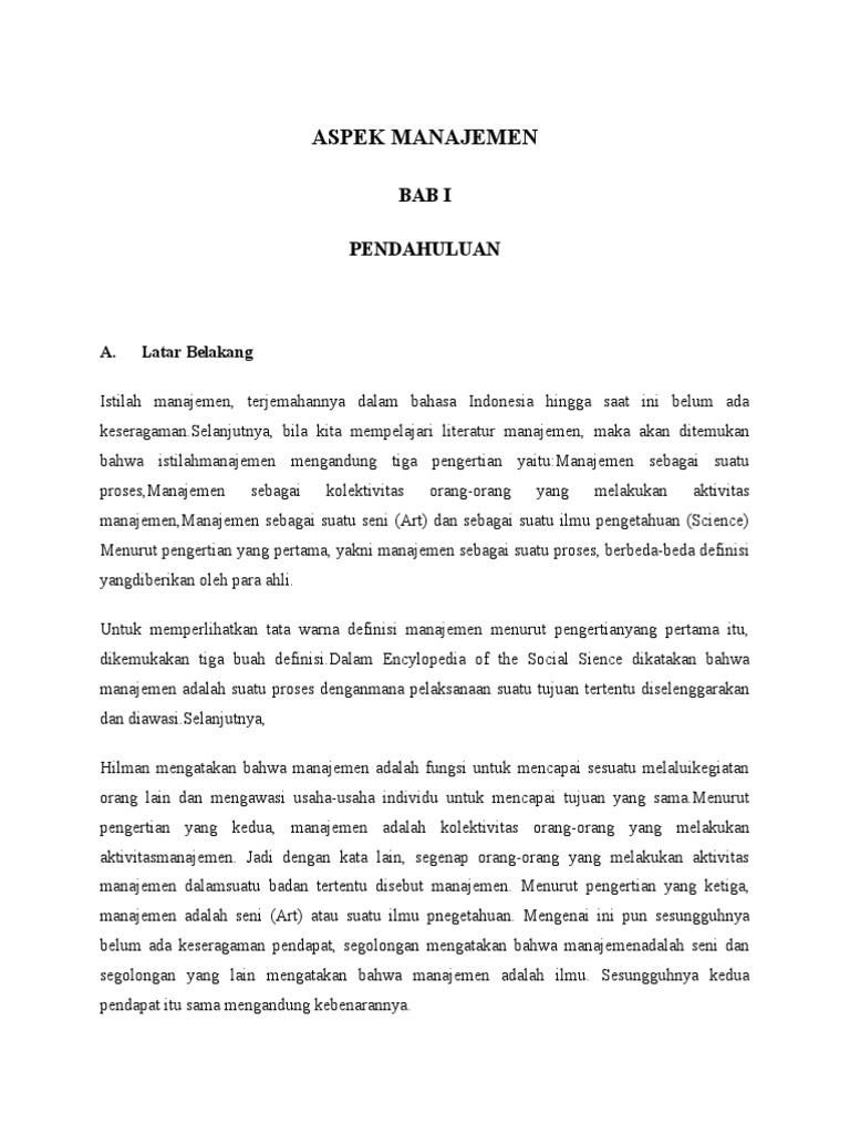 Pengertian aspek manajemen aspek manajemen merupakan suatu aspek yang memperhatikan kaidah, tahapan atau fungsi dalam proses manajemen dalam mencapai tujuan yang hendak dicapai oleh suatu perusahaan atau organisasi. Suatu kegiatan yang mempelajari secara mendalam tentang suatu kegiatan atau usaha yang akan dijalankan, untuk menentukan layak atau tidaknya suatu bisnis dijalankan.tujuan utama dilakukan studi kelaykan bisnis ini tentunya yang akan berdiri bisa berjalan sesuai harapan baik dalam jangka pendek atau panjang. Dari manajemen sdm hingga manajemen finansial badan usaha.
