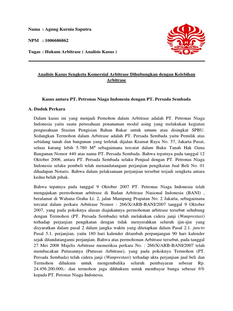 Penyelesaian melalui arbitrase dalam banyak contoh sengketa bisnis, misalnya antara pemerintah indonesia dengan perusahaan asing, cara penyelesaian dilakukan melalui arbitrase. Tetapi a meninggal dunia 1 tahun sejak perjanjian berlangsung. 22 berhubungan dengan waktu penyelesaian sengketa yang cepat, maka akan berpengaruh pada biaya arbitrase yang tidak semahal biaya peradilan biasa.