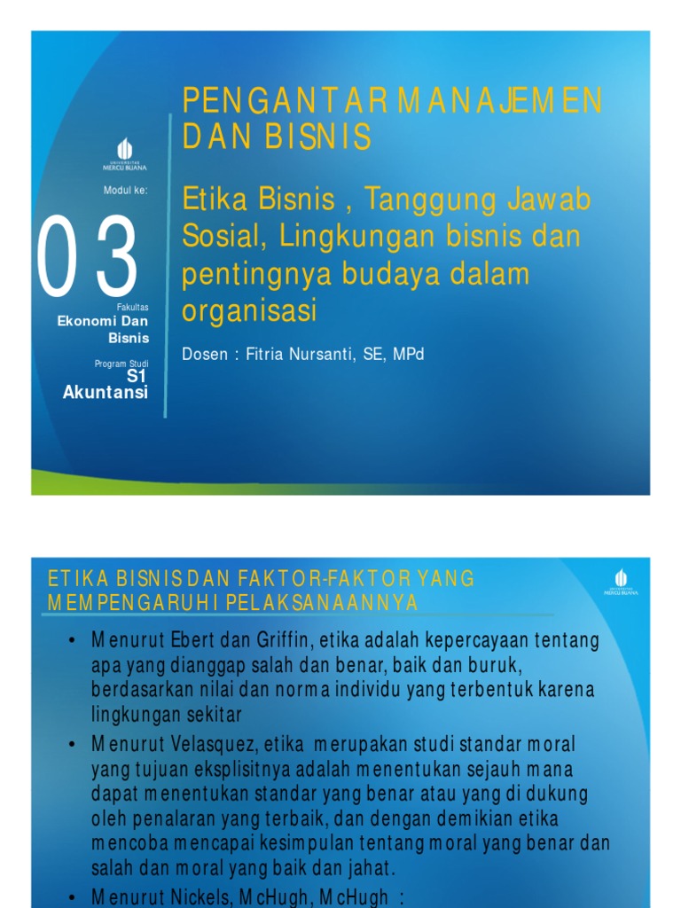 34 full pdfs related to this paper. Etika bisnis dan tanggung jawab sosial 7. Bapak / ibu dosen yth, silahkan mengedit deskripsi dari matakuliah pengantar bisnis dan manajemen ini.