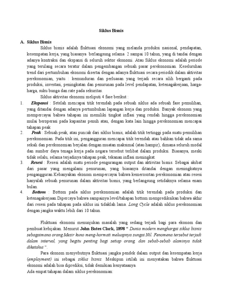 Berita terbaru seputar bisnis, ekonomi finansial dan investasi di indonesia dilengkapi dengan informasi terkini nasional, politik, olahraga, bola dan lifestyle Siklus bisnis atau siklus ekonomi adalah pergerakan menurun dan menaik dari produk domestik bruto (pdb) di sekitar tren pertumbuhan jangka panjangnya. Meskipun tidak ada dua siklus bisnis yang persis sama, mereka dapat diidentifikasi sebagai urutan dari empat fase yang diklasifikasikan dan dipelajari dalam pengertian paling modern oleh ekonom amerika arthur burns dan wesley mitchell dalam teks mengukur siklus bisnis.
