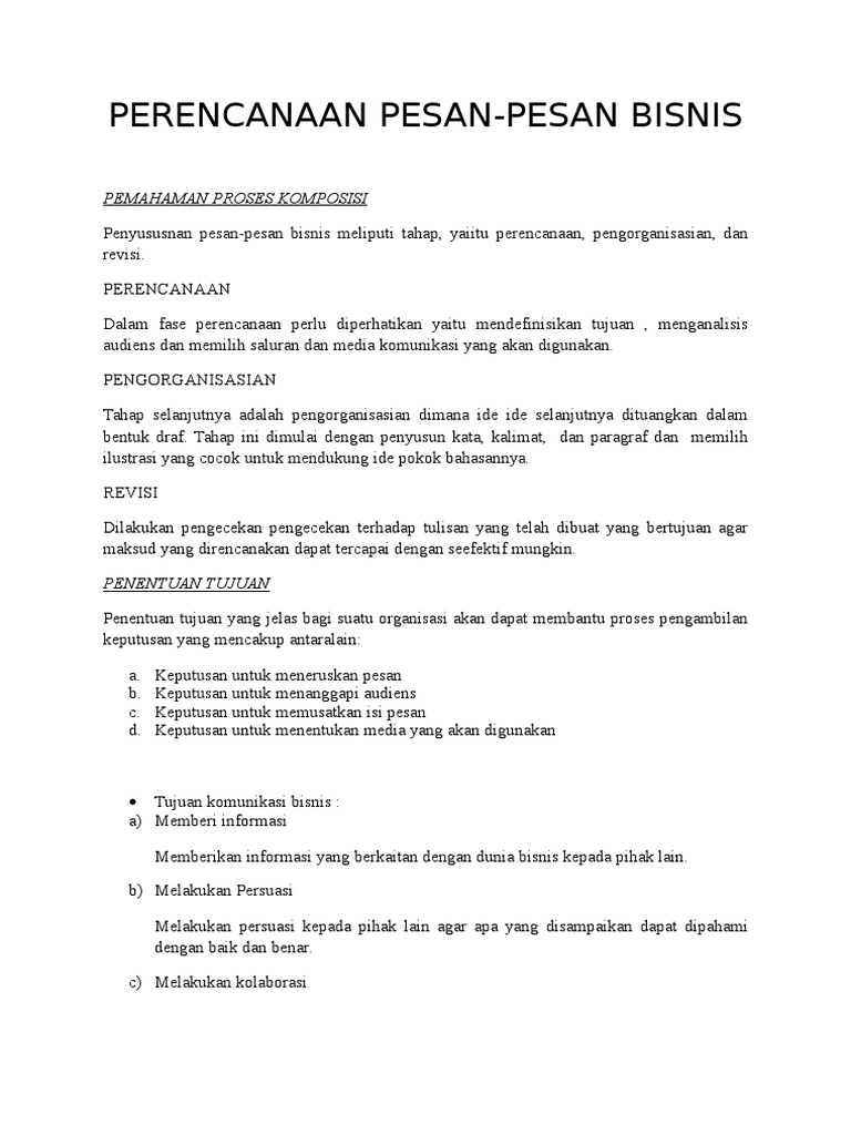 Makalah perencanaan pesan bisnis. Pesan bisnis adalah suatu pesan atau surat yang digunakan oleh pengirim (source). Informasi yang semakin mudah didapat akibat adanya perkembangan teknologi membuat batas batas antar negara semakin pudar. [email protected] abstrak bisnis merupakan suatu kegiatan yang dilakukan oleh perorangan maupun organisasi yang melibatkan aktivitas produksi, penjualan pembelian mapupun pertukaran barang/jasa, dengan tujuan mendapatkan keuntungan/laba.